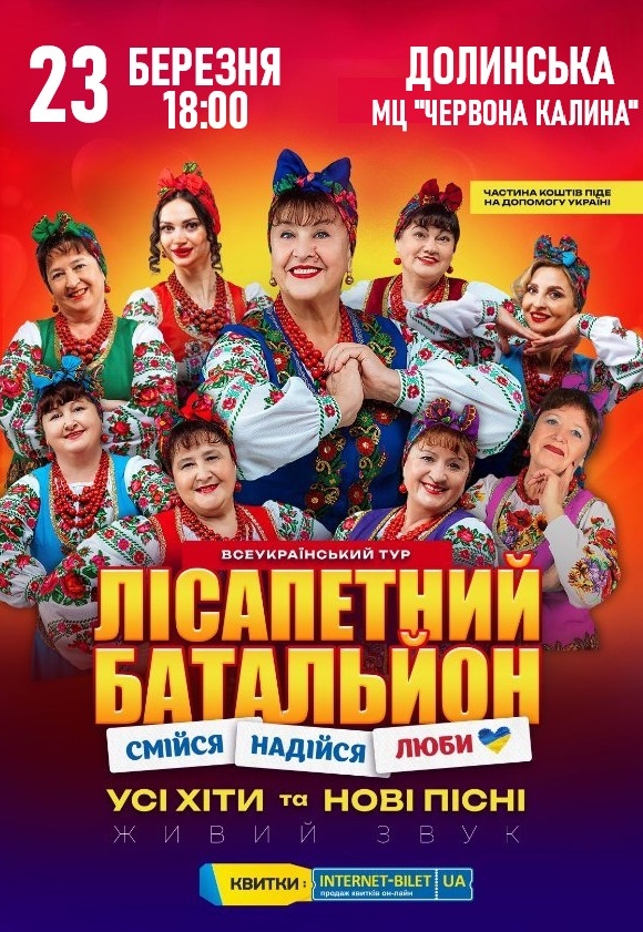 Лісапетний Батальйон відбудеться 23 березня 2026, 18:00, понеділок в МЦ "Червона калина". За допомогою сервісу internet-bilet.ua, Ви зможете з легкістю забронювати, замовити та купити квитки на концерт, спектакль, оперу, балет, майстер-класи, спортивні та дитячі заходи, що Вас цікавлять, оплативши їх найбільш зручним для Вас способом: через інтернет банківською карткою VISA/MasterCard, готівкою або кур'єром, якщо зробите замовлення квитка з доставкою.